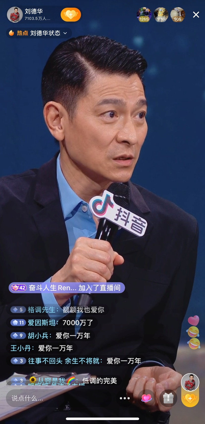 刘德华直播. 73万 播放 222 弹幕 拒绝8000万粉丝刷礼物刘德华的清醒扯下多少明星的遮羞布 娱圈老表. 它们是属于绝对的天王 刘德华 的也是属于 抖音 的. 刘德华离开直播间时达到了8600万但即使是他离开了直播间粉丝们依然没有离开最终在粉丝们的坚守下这场时长为25小时的直播观看人次达到了1亿最高同时在线人数近400万创造了抖音直播的新纪录 1一场不平常的日常直播 回归到内容本身这场名为这平常的一天的.
